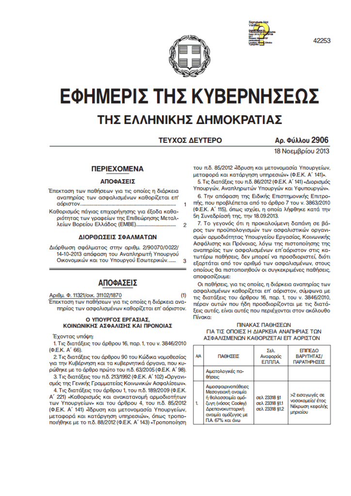 Έπεκταση των παθήσεων για τις οποίες η διάρκεια αναπηρίας των ασφαλισμένων καθορίζεται επ’ αόριστον.